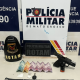 Os policiais seguiram ao endereço e encontraram três suspeitos, que fugiram para uma região de mata. Nas buscas, dois homens foram encontrados enquanto tentavam entrar em um veículo de transporte por aplicativo. A dupla estava com uma sacola contendo porções de drogas e uma arma de fogo artesanal.