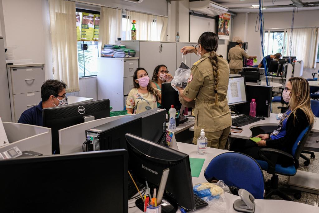 Durante a entrega, as pessoas são orientadas sobre o uso obrigatório da máscara e, ainda, a manter um distanciamento mínimo de 1,5 metros entre si, além de lavar constantemente as mãos e utilizar álcool em gel para higienização.