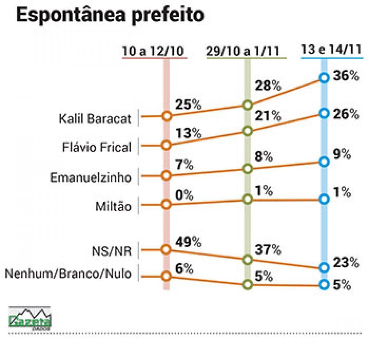Neste caso, Kalil Baracat é o preferido de 36% dos entrevistados, seguido por 26% atribuídos a Frical e 9% para Emanuelzinho. Milton obteve 1% das intenções de votos. Na pesquisa anterior, a preferência por Kalil era de 28%, o que mostra que houve um aumento de 7 pontos percentuais. Ao mesmo tempo, também houve crescimento de 5 pontos percentuais na opção por Frical, antes de 21%.