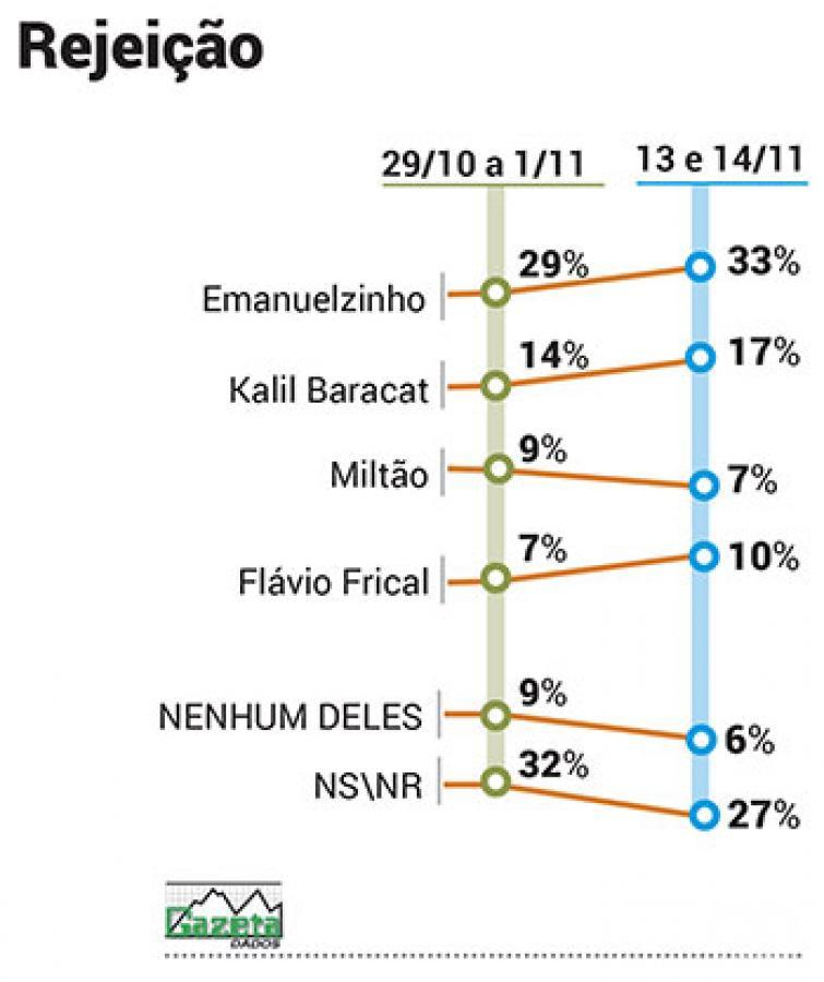 Quem também não melhorou foi Kalil Baracat candidato apoiado pela atual prefeita Lucimar Campos (DEM). Baracat era rejeitado por 14% dos eleitores, mas de acordo com a última pesquisa este número foi para 17%. A rejeição acompanhou uma leve queda nas intenções de votos válidos do candidato.
