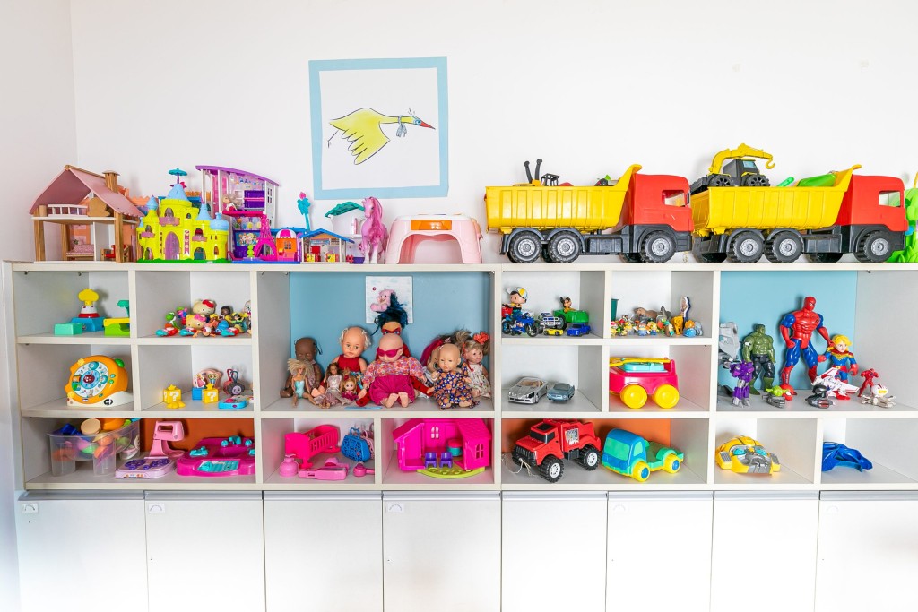 A foto ilustra brinquedos disponíveis em um armário de cor branca. É possível visualizar caminhões coloridos e bonecos que remetem a super heróis.