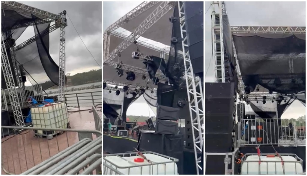 A imagem mostra a estrutura do evento, danificada pela água e pelo vento.
