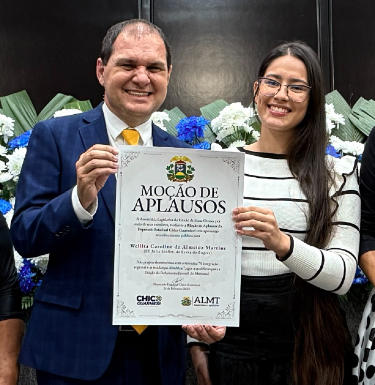 A Assembleia Legislativa de Mato Grosso (ALMT) homenageou a estudante Wellita Caroline de Almeida Martins, de 17 anos, natural de Barra do Bugres, em reconhecimento à sua participação no Parlamento Juvenil do Mercosul (PJM), edição 2024-2026. A indicação foi feita pelo deputado estadual Chico Guarnieri (PRD), que apresentou uma moção de aplausos à jovem e a outros cinco estudantes da rede estadual de ensino, todos selecionados para representar o Estado de Mato Grosso na etapa internacional do programa. A entrega da honraria ocorreu na última quarta-feira (2).