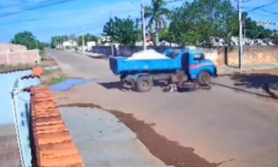 Jovem é atropelado e morto por caminhão após cair de moto; VEJA O VÍDEO
