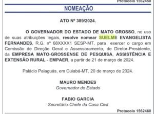 O governador Mauro Mendes (UB), nomeou no último dia 21.03, o ex-secretario da secretaria de agricultura familiar no governo de Pedro Taques , e ex deputado Suelme Fernandes, no cargo de direção como presidente da Empresa Mato-grossense de Pesquisa, Assistência e Extensão Rural  ( Empaer), no lugar de Flavia  de Souza Almeida.