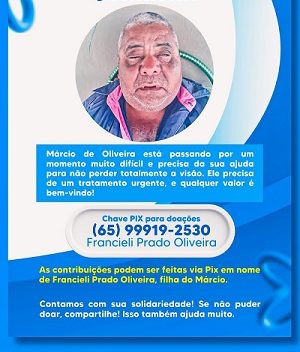 “Eu sou diabético, tomo insulina, e agora estou com esse problema na visão. Preciso fazer o exame e o transplante de córnea. A consulta já está marcada, mas ainda falta o dinheiro da cirurgia. Peço a ajuda de quem puder colaborar. Deus abençoe a todos”, disse Márcio.