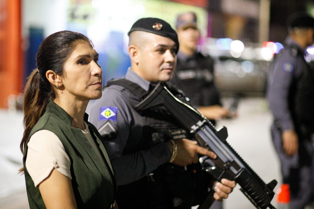 A foto mostra a secretária de Segurança Pública de Cuiabá, coronel Francyane, ao lado de um policial militar durante a ação integrada.
