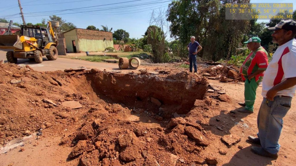 A Prefeitura de Várzea Grande, por meio da Secretaria de Viação e Obras, iniciou hoje (20), um serviço emergencial de recuperação na rua Pau Brasil, esquina com a rua Comendador Santos, no bairro jardim Alá. O local registrou a abertura de um buraco de grandes proporções, que comprometia a passagem de veículos e representava risco aos moradores. O tráfego ainda não está liberado e só deve ser retomado após a conclusão dos trabalhos, prevista para a próxima sexta-feira.