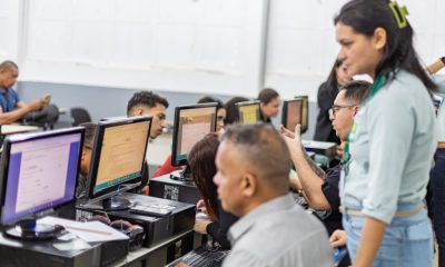 A imagem que ilustra a matéria mostra ambiente de uma feira de empregabilidade promovida pelo Sine Cuiabá.