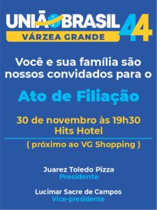 Visando atingir a 7 mil filiados o União Brasil de Várzea Grande vai reunir suas principais lideranças em ato político no próximo dia 30 de novembro as 19:30 no Hits Hotel, próximo ao Aeroporto Marechal Rondon e ao VG Shopping.