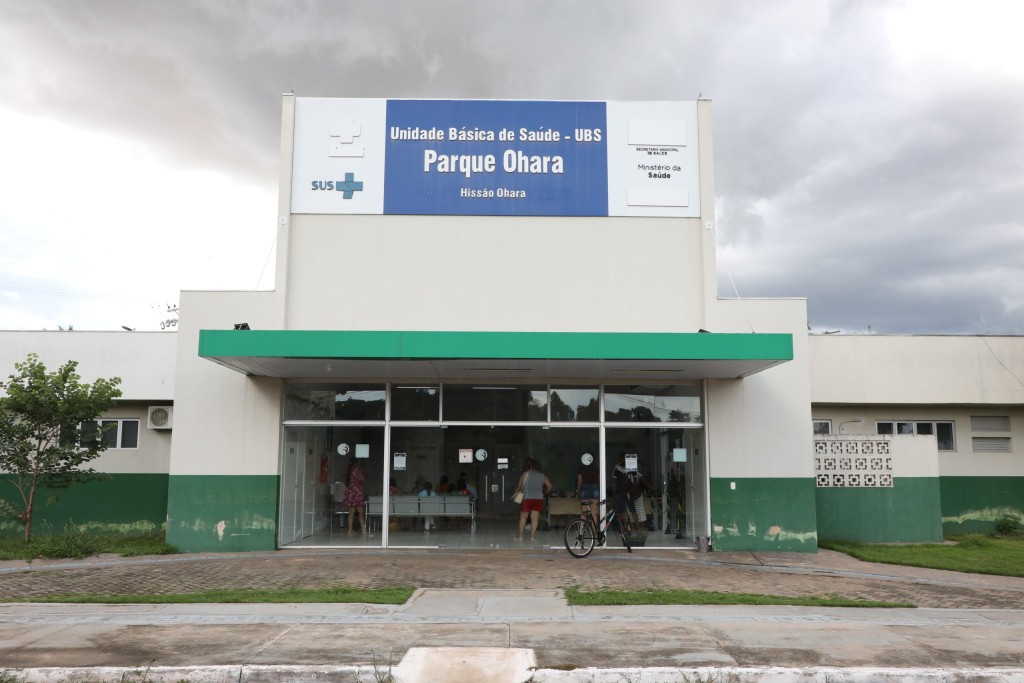 A foto principal mostra a fachada da UBS Parque Ohara. O prédio, de um pavimento, é pintado nas cores branca e verde. Na frente há um letreiro azul, com letras brancas indicando o nome da unidade.